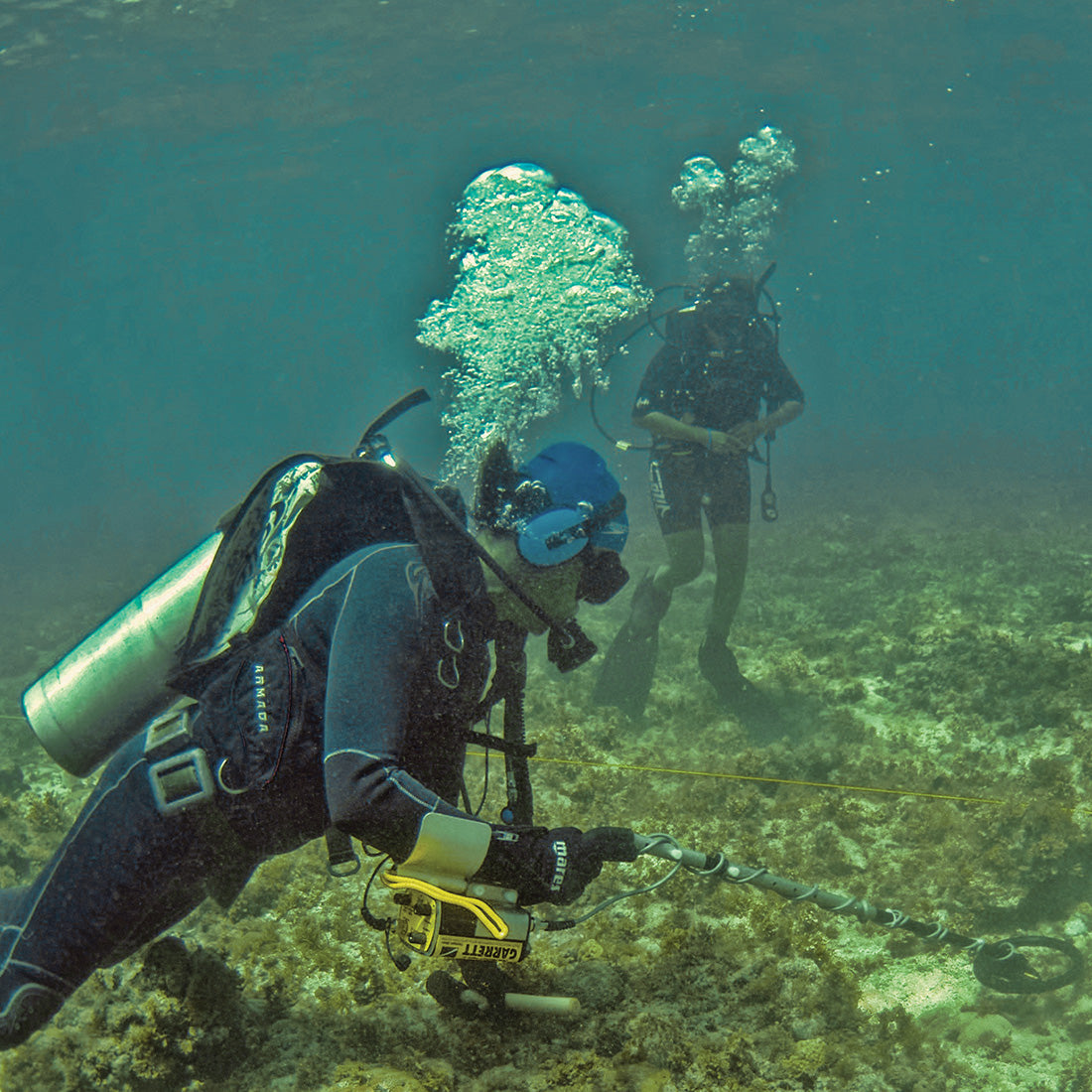 Garrett Sea Hunter für Taucher | Sondeln unter wasser bis zu einer Tiefe ovn 60 metern. Mit wasserfestem blauem Garrett Kopfhörer.