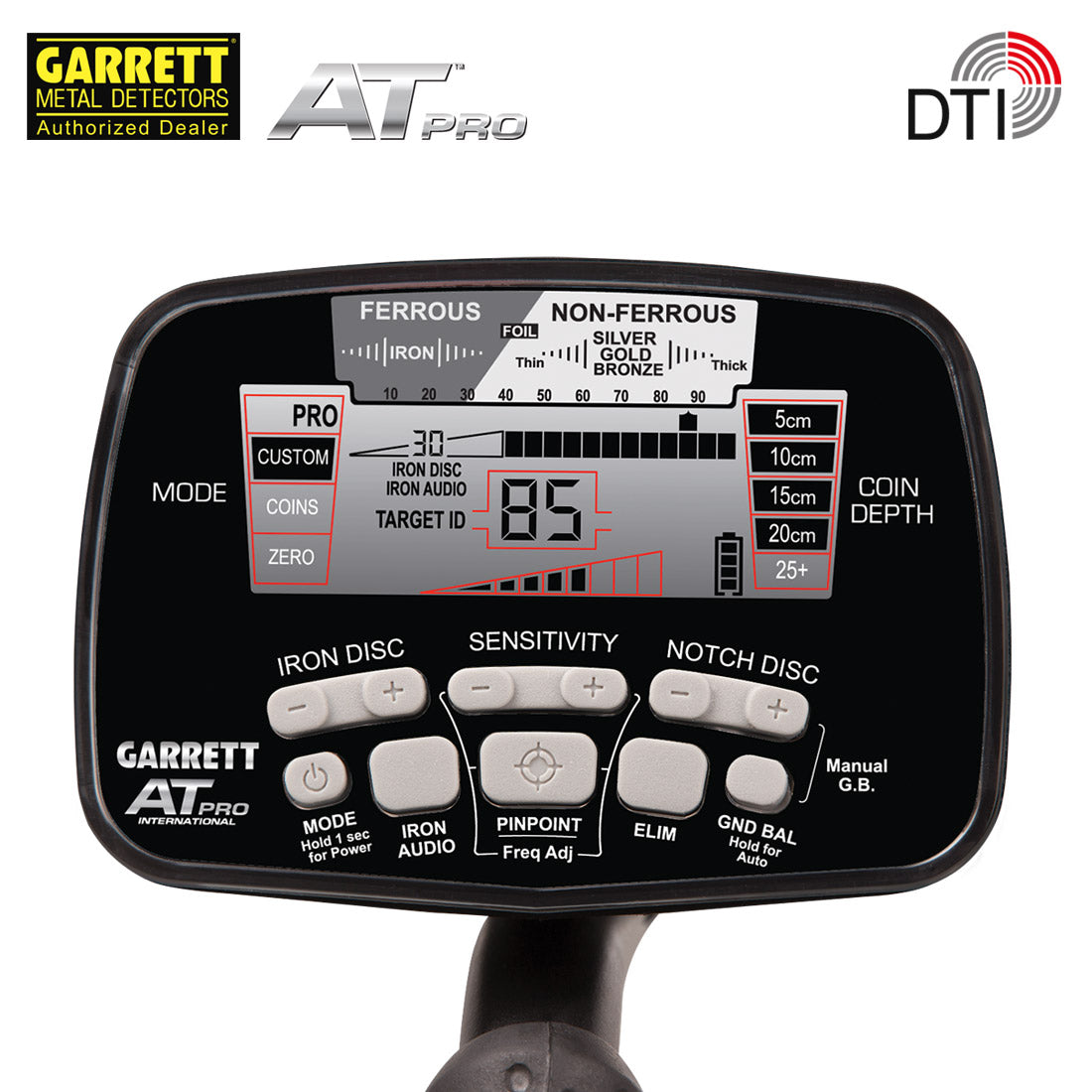 Metalldetektor Set! Das DTI Marken-Metalldetektor Paket beinhaltet den Garrett AT Pro International Metalldetektor, den MS-2 Kopfhörer, die Garrett Fundtasche, eine Abdeckkappe und das DTI "Handbuch für Schatzsucher". Den bewährten AT Pro zeichnet eine gute Suchgeschwindigkeit, Objektidentifizierung und zuverlässige Detektion aus.