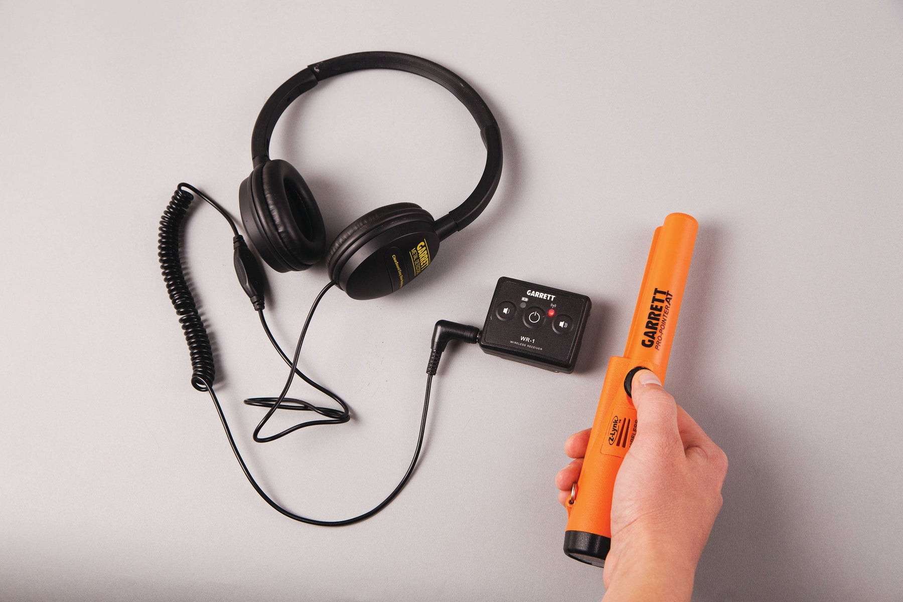 6,3mm Kopfhörer, zB. Easy Stow, MS3, MS2 oder Garrett Treasure Sound Kopfhörer. Seperat kann auch ein AT PinPointer Z-Lynk gekoppelt werden.