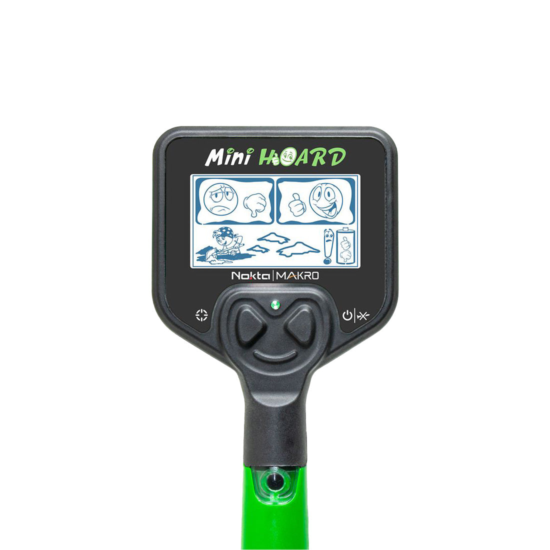 Das Display des Kinderdetektor ist leicht verständlich und übersichtlich gestaltet. Der Mini Hoard ist über 2 Tasten zu bedienen. Der rechte Knopf dient zum Ein- und Ausschalten des Detektors sowie zum Ein- und Ausschalten der Eisensuche. Der linke Knopf ist die Pinpoint-Funktion um genau zu bestimmen wo sich das Objekt befindet. Die klare Anzeige zeigt mit Emoticons an, wenn ein Eisenobjekt gefunden wurde oder wenn es sich um einen Nicht-Eisenobjekt (Edelmetall) handelt ...