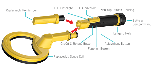 Der neue auffällig leuchtend gelbe PulseDive ist ein 2-in-1 Pulsinduktionsdetektor, der schnell vom Scuba-Detektor in einen PinPointer verwandelt werden kann und umgekehrt! Die Impulsinduktion, die als leistungsstarke Technologie einen stabilen Betrieb in Salzwasser oder jeglichen Boden erlaubt.